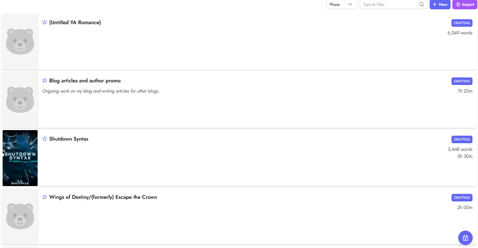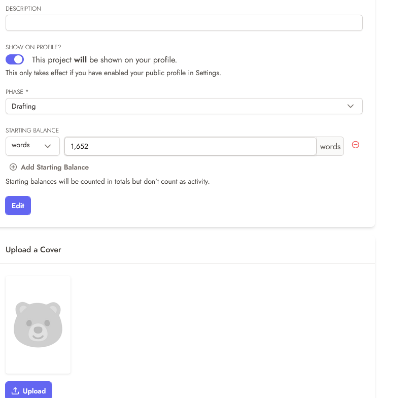 When you add a new project, you have several items you can enter. Obviously a title of some kind and description. But you can also set a phase you are in (planning, drafting, outlining, revising, on hold, etc). Finally, you can add a starting balance of words (or whatever you have tracked previously).