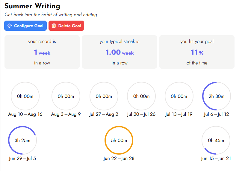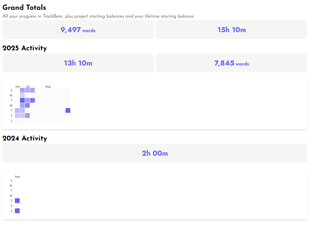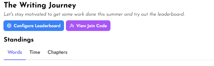 This past summer, the Writing Journey tested Trackbear and used the leaderboard. We mainly tracked these three stats, though others were open as well.